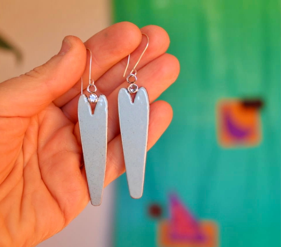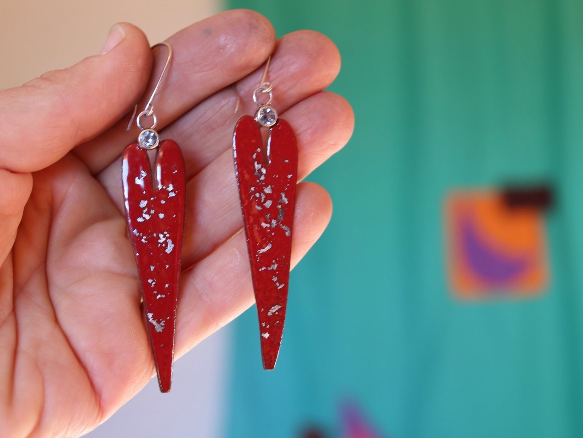 Aros de cobre esmaltado al fuego, Plata y aguamarina o granate. Aplicaciones de plata.